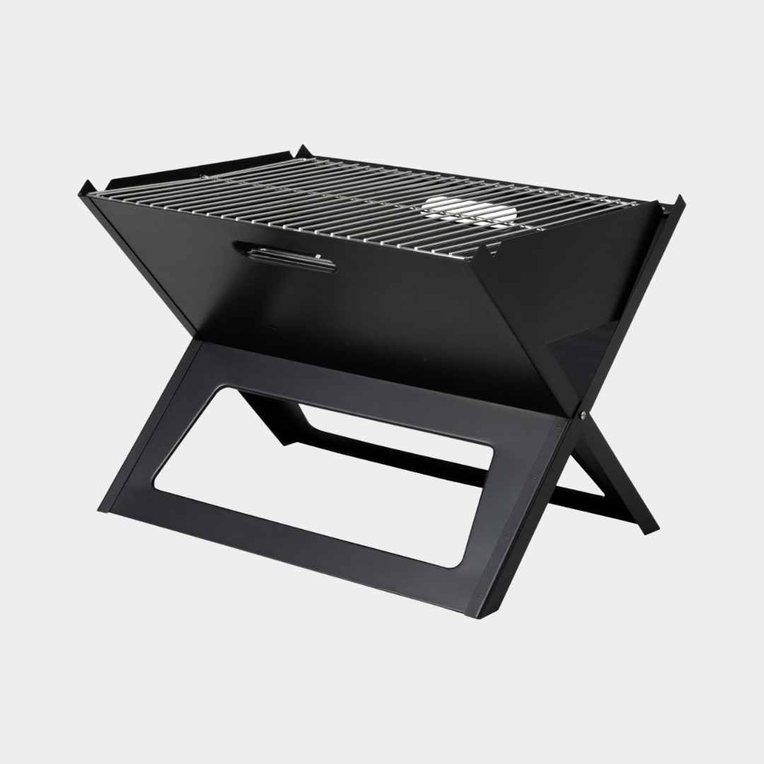 - Constructed of high-heat-resistant-painted steel, this sturdy grill folds flat to create its own carrying case. This charcoal BBQ grill can be folded up in an instant for easy portability.