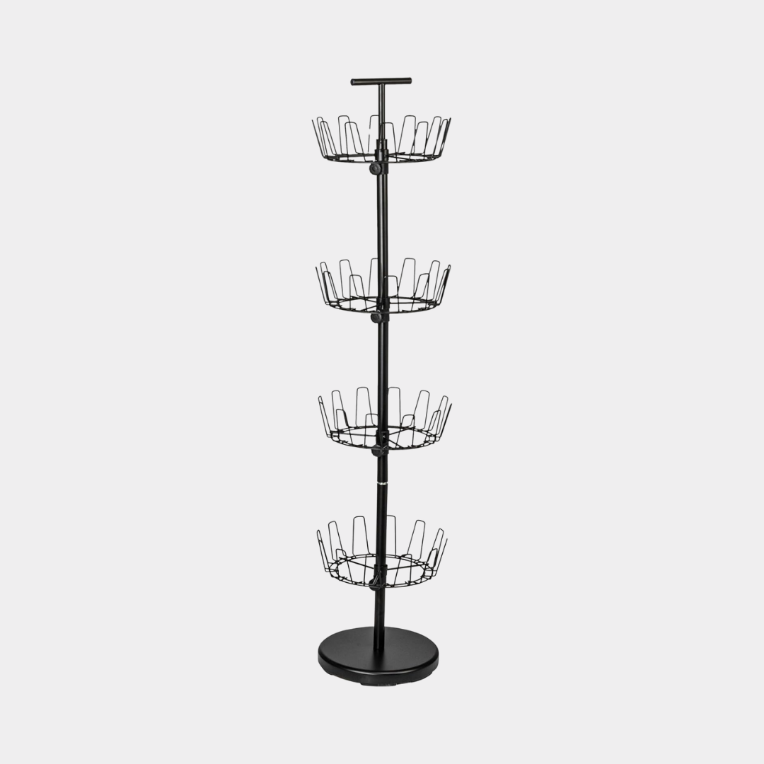 - Space-saving shoe tree stores 24-pairs of shoes on spinning shoe racks; invert racks to display high heels